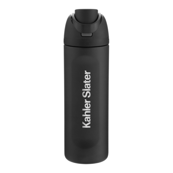 24 oz double wall 18/8 stainless steel thermal bottle with copper vacuum insulation, dual-purpose threaded lid, push-button locking mechanism, sip opening, built-in straw, and powder coated finish.